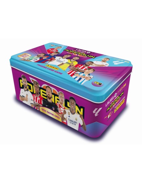 Limited edition tin of the official Panini Adrenalyn XL football card collection from the 2023-2024 La Liga season. The tin contains a total of 45 cards: 4 limited edition + 6 updates + 18 special + 17 regular. Tin measurements: 16.5 x 10 x 7 cm.