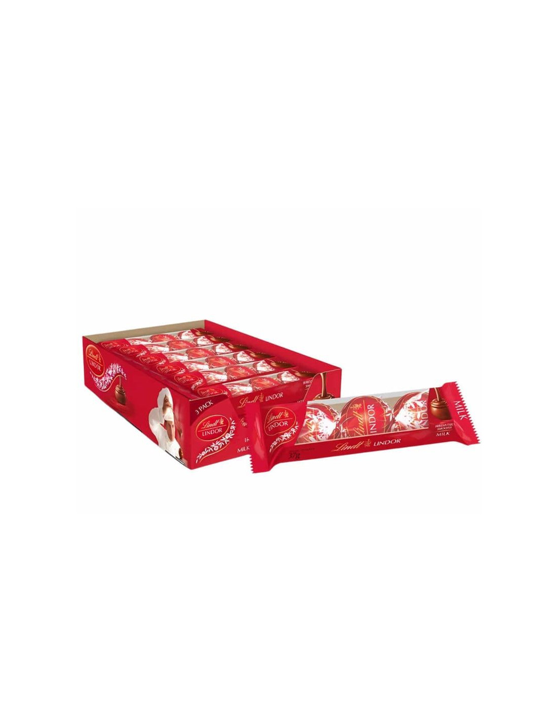 Premium Swiss milk chocolate pralines from Lindt with a creamy interior. Each praline is individually wrapped and served in packs of 3 chocolates each. Box with 12 packs of 3 chocolates.