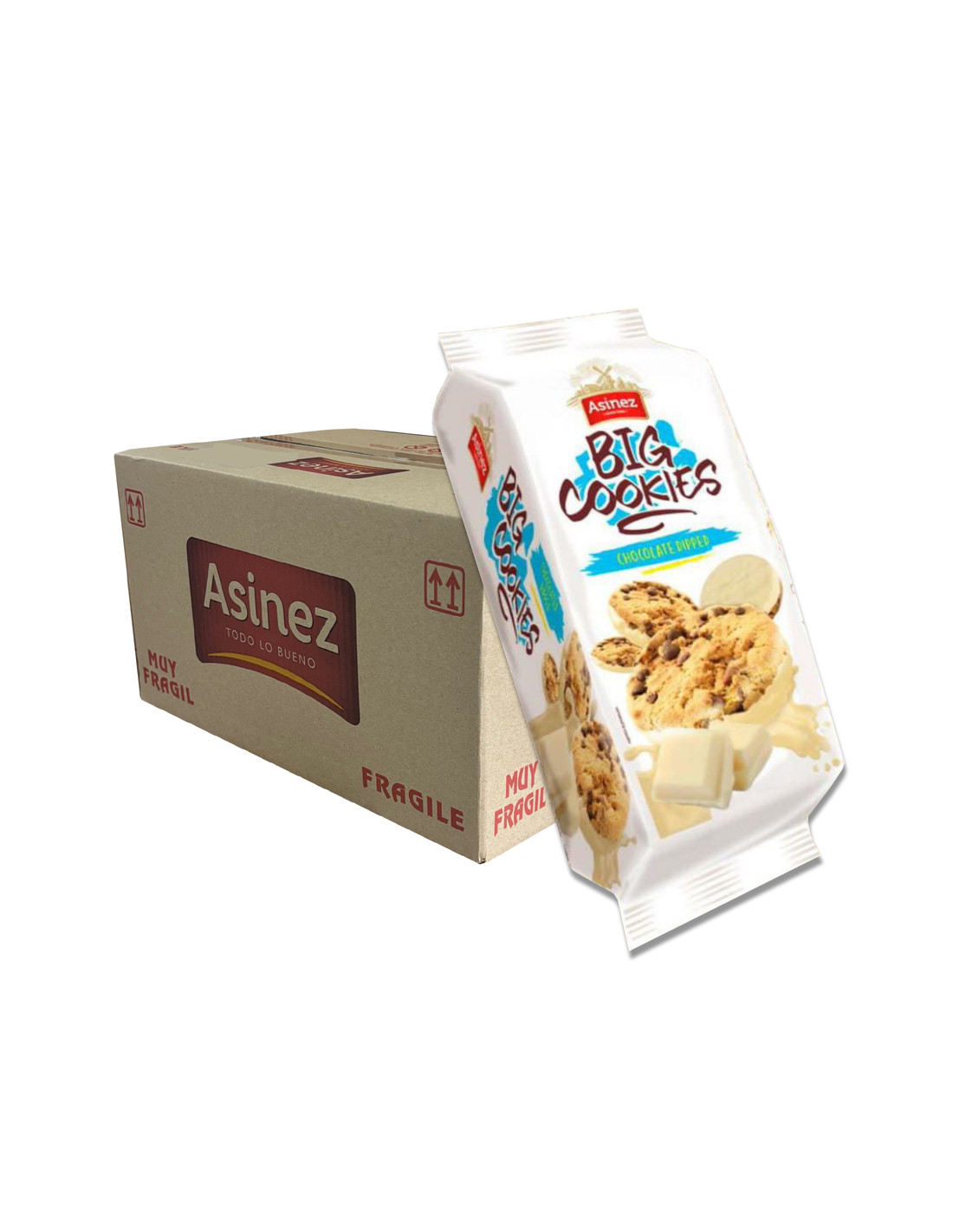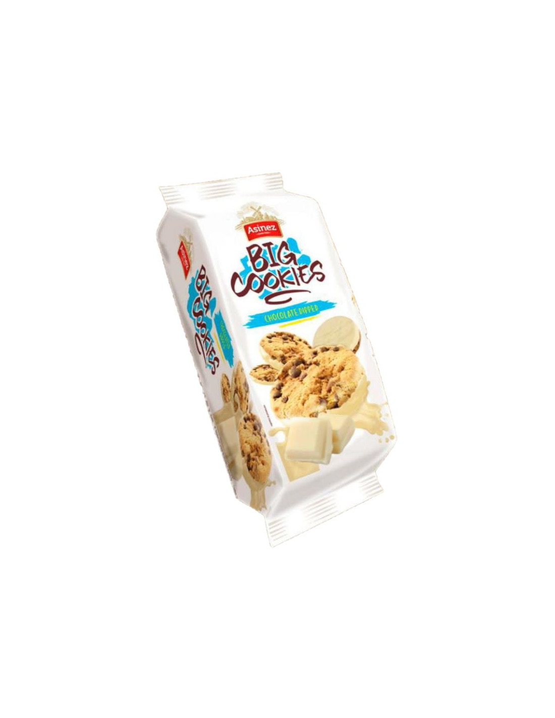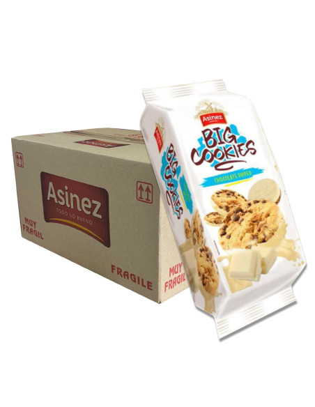 Large, crunchy round cookies from the Asinez brand. They're made with baked wheat and partially coated in white chocolate and covered with milk chocolate chips. Each package weighs 140 grams and contains 6 cookies. Box contains 16 packages.