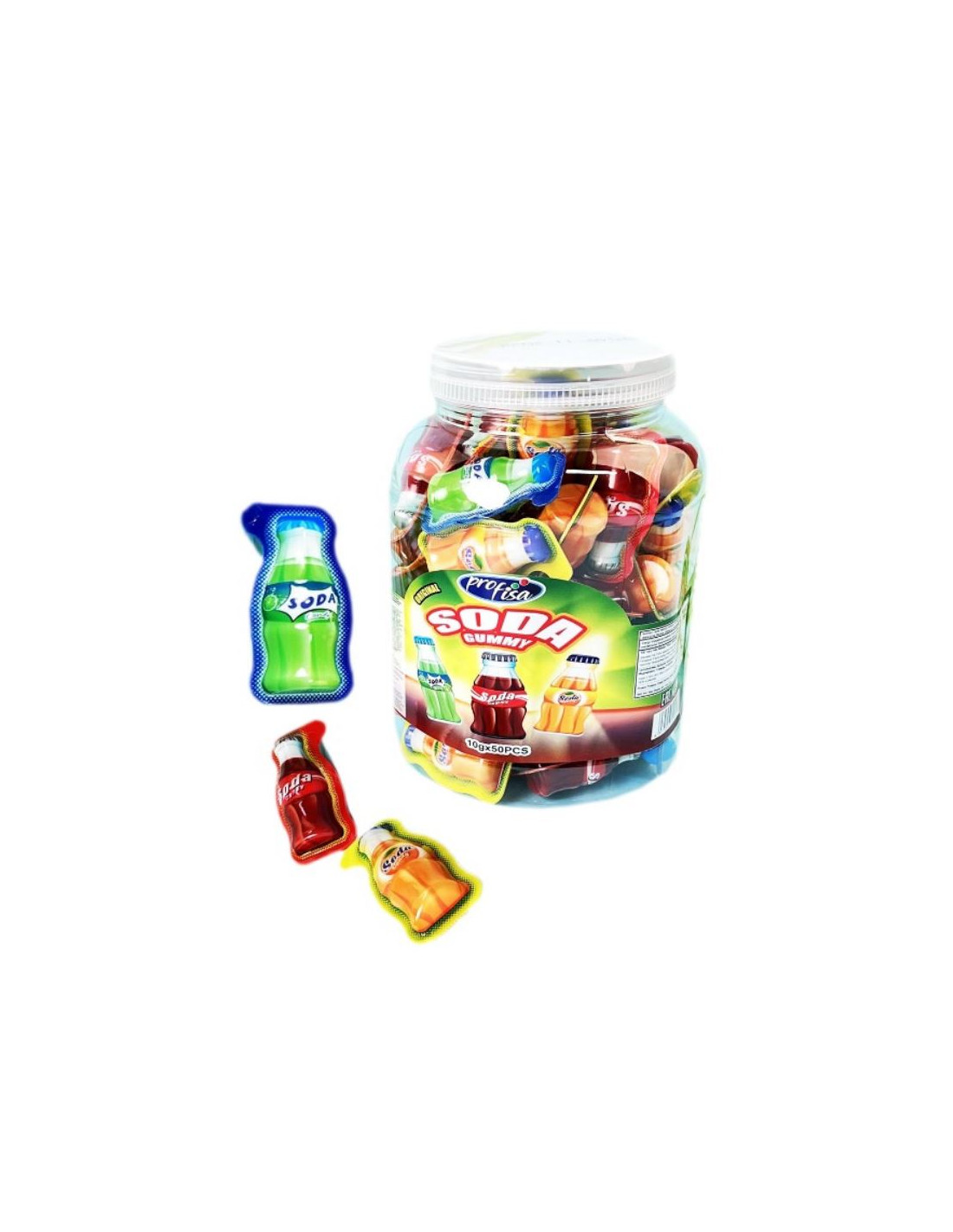 Soft drink shaped gummy jellies in individual plastic capsules, with fruit flavours. Jar with 50 gummies.