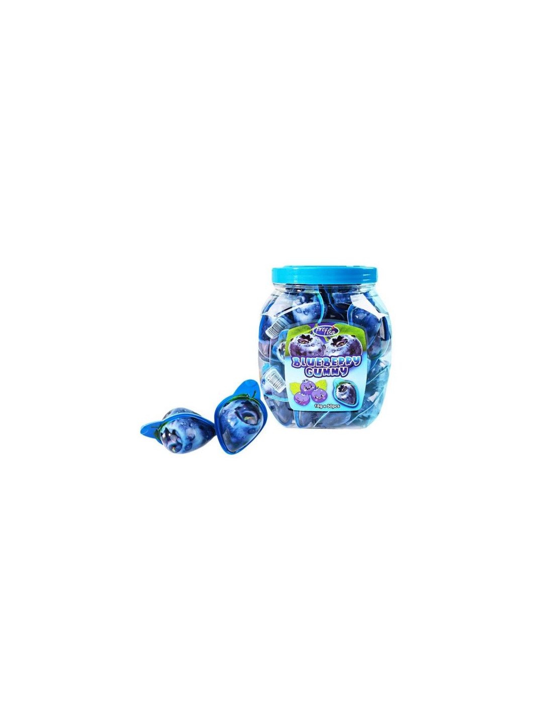 Tender, large-sized gummy jelles filled with blueberry-flavored gelatin. Each jelly is packed in an individual plastic capsule and weighs 18 grams. Jar with 50 gummy jellies.