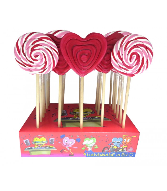 Round and heart-shaped hard candy lollipops, pink, white and red, with strawberry and strawberry and cream flavour. Each lollipop is served individually wrapped in cellophane, weighs 60 grams and measures 25 centimeters long by 7.5 wide. The stick is wooden. Display box with 24 lollipops.