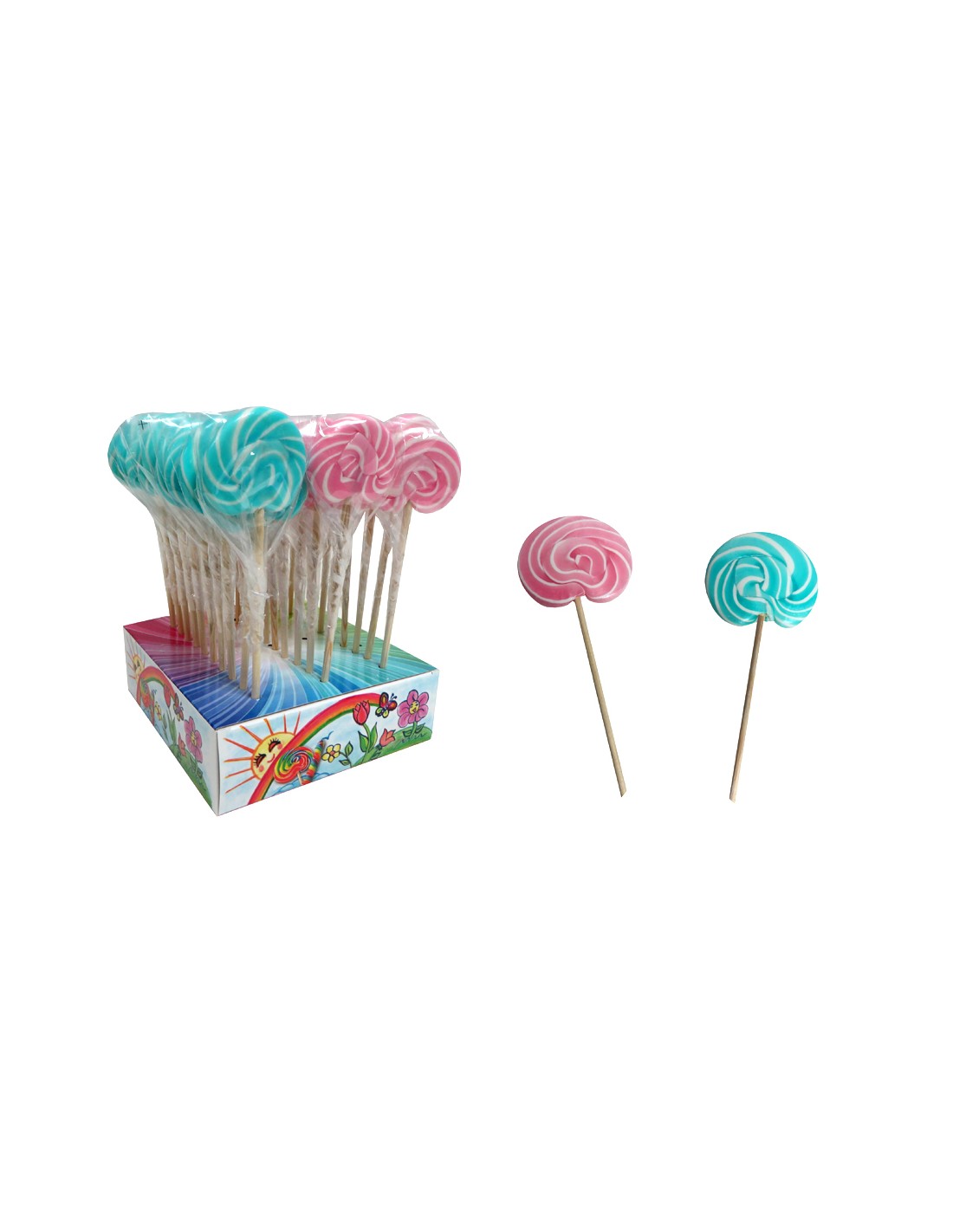 Round candy lollipops with a wooden stick, blue and pink in color and with strawberry flavor. Each lollipop is individually wrapped and weighs 25 grams. Measurements: 6 centimeters in diameter by 21 centimeters long. Box with 30 lollipops.