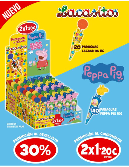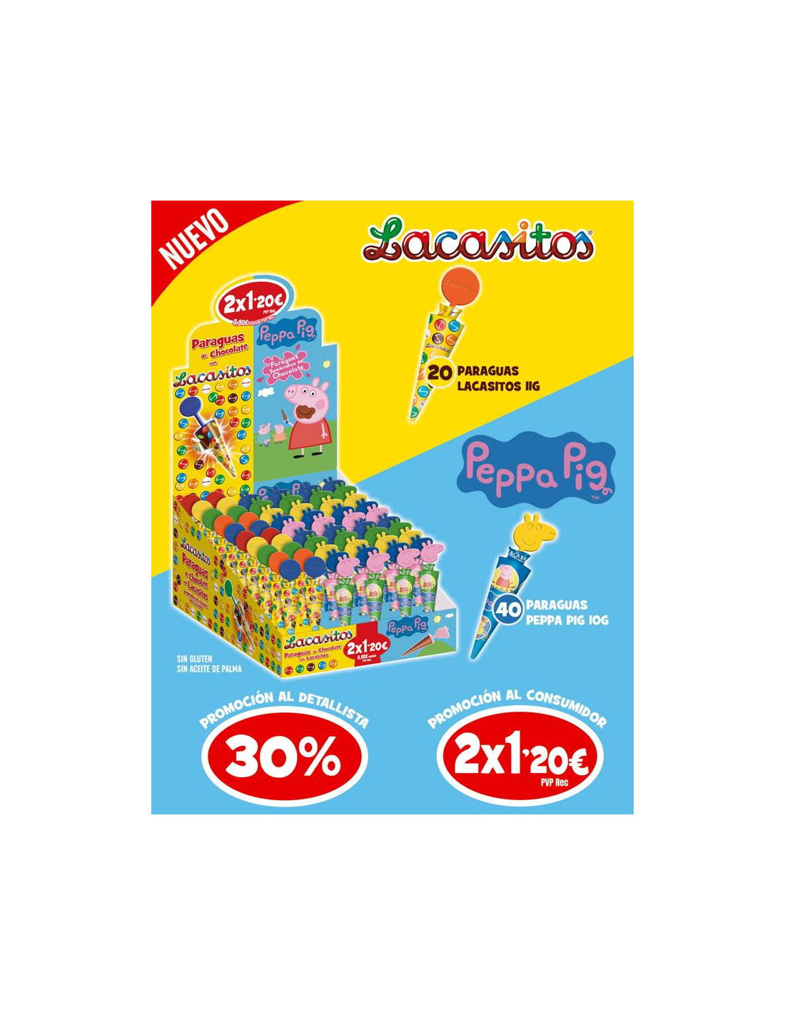 Lacasa milk chocolate umbrella set consisting of 40 Peppa Pig umbrellas weighing 10 grams each and 20 Lacasitos umbrellas weighing 11 grams each. Each umbrella is individually wrapped.