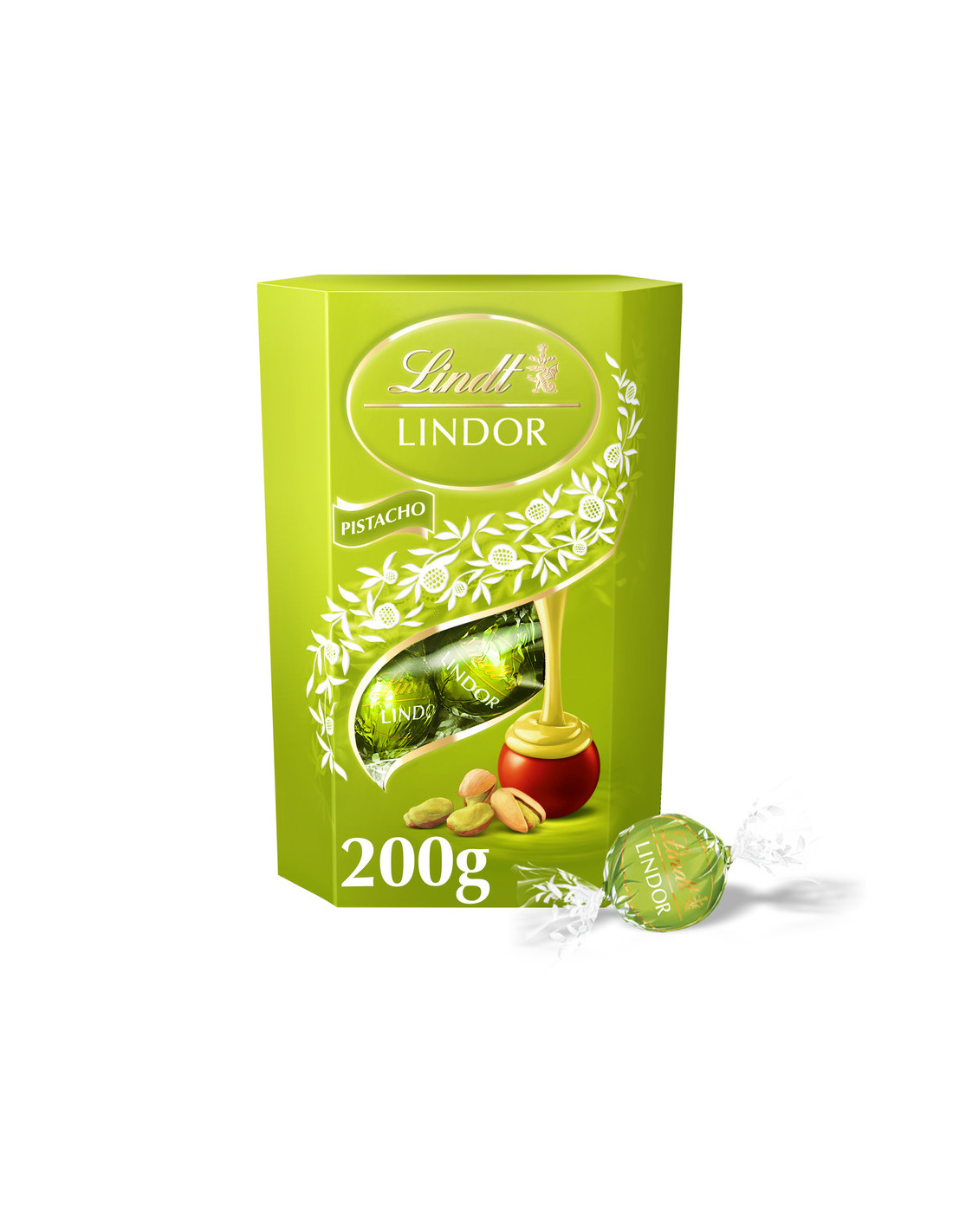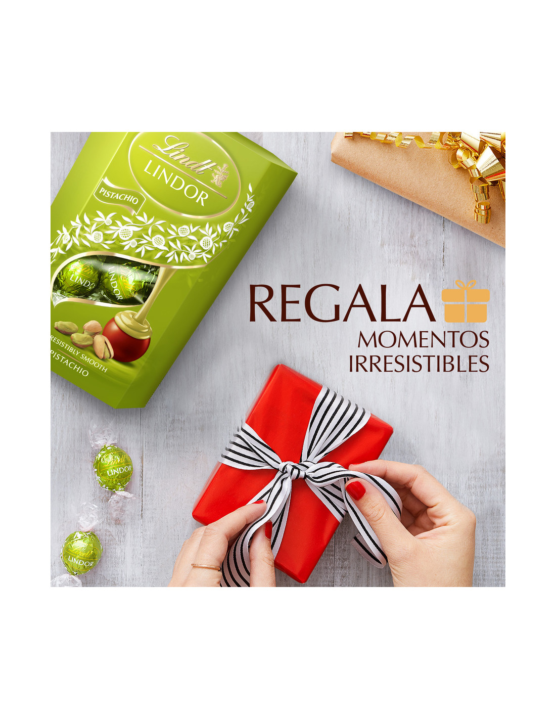 Premium chocolates from the Swiss brand Lindt, made with milk chocolate and a creamy pistachio-flavored filling. They are round and each piece is wrapped. Box with 16 chocolates.