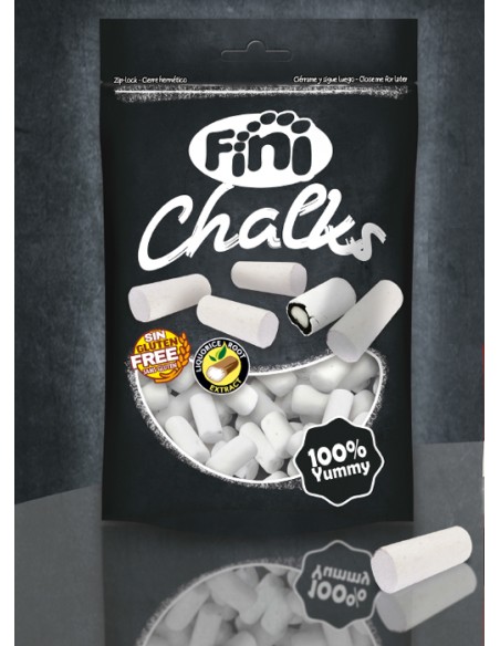 Black licorice sticks filled with sugar paste and covered with white candy, shaped like blackboard chalk. Each package contains 160 grams and has a zip opening system. Box with 10 packages.