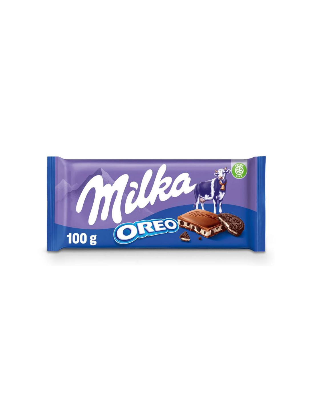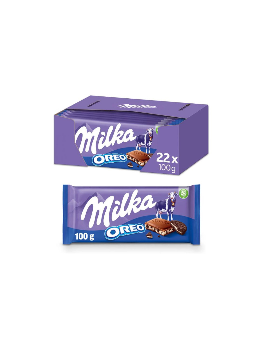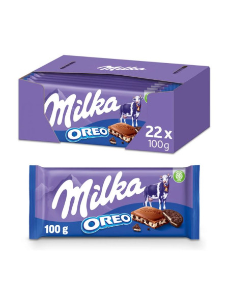 Milka milk chocolate bar filled with Oreo biscuit. Each bar weights 100 grams. Box of 22 bars.
