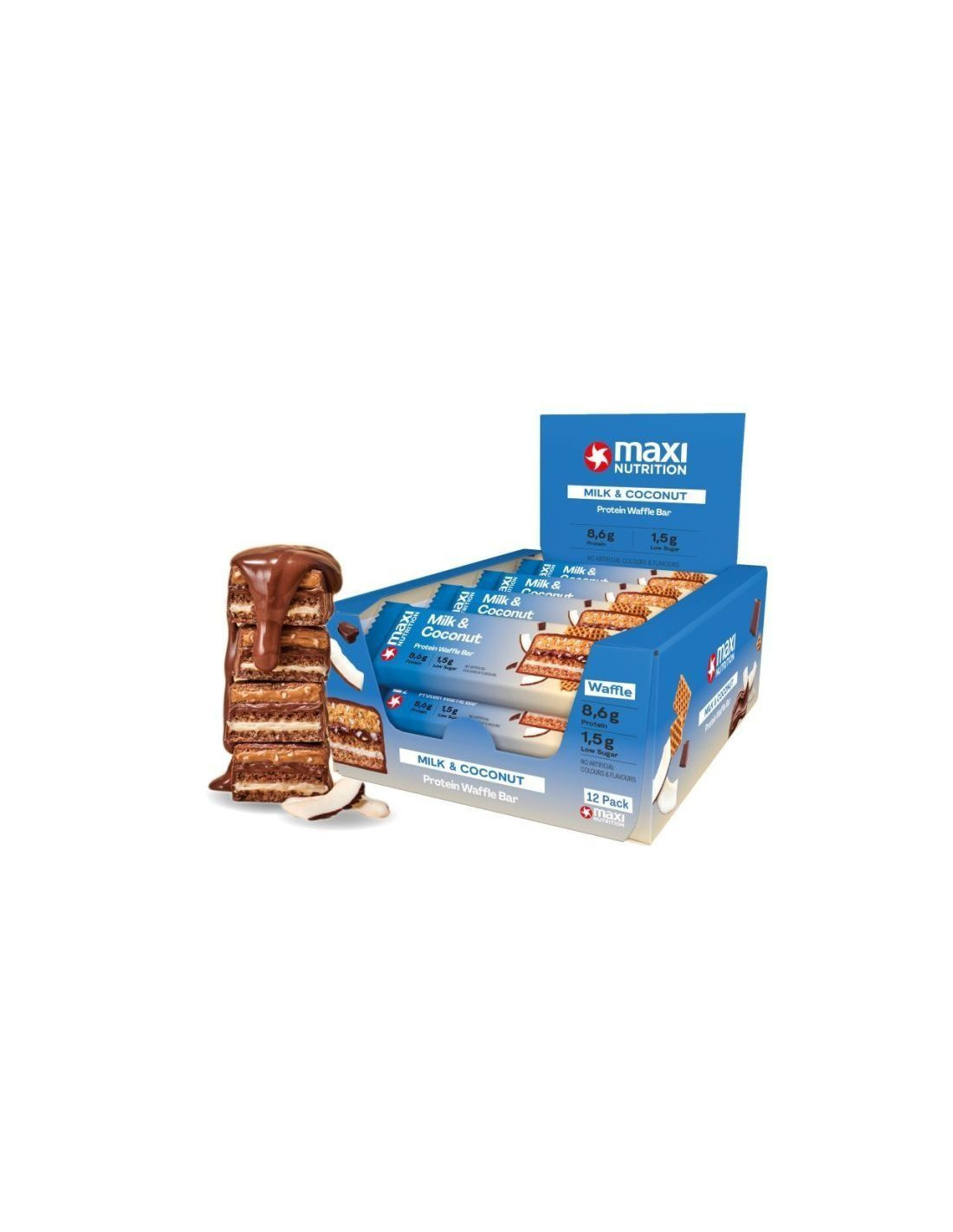Maxi Nutrition chocolate protein bars. Made with crispy, light wafers, creamy milk chocolate, and coconut flakes. Each bar weighs 40 grams, contains 8.6 grams of protein, and is low in sugar. No artificial flavors or colors. Box contains 12 bars.