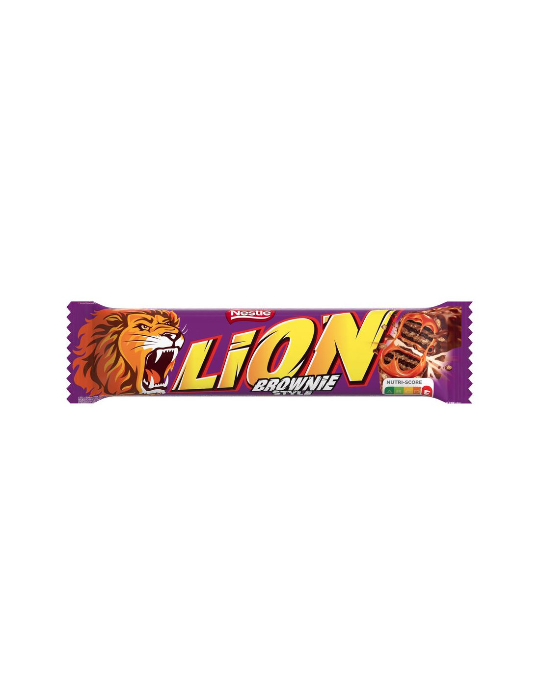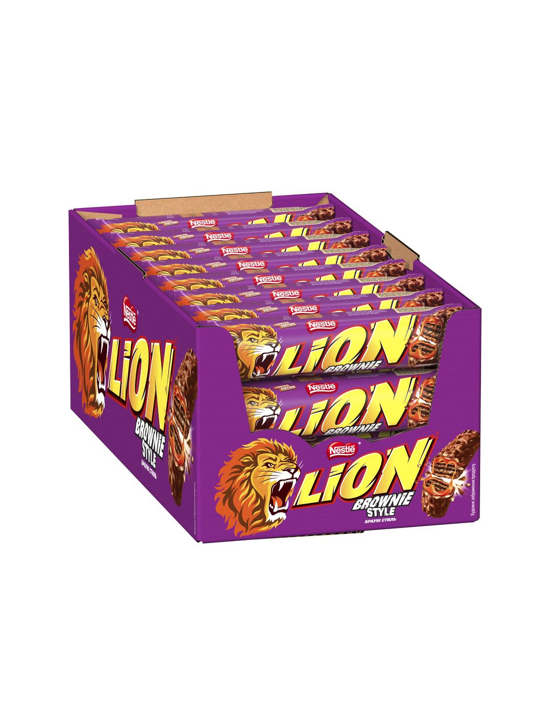 Nestlé Lion biscuit bars filled with chocolate brownie-flavored cream, creamy caramel, and cereal, and coated in milk chocolate. Each bar is individually wrapped and weighs 40 grams. Box contains 24 bars.