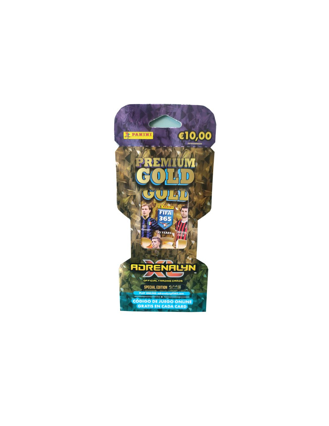 Premium Gold envelope from the special collection of cards and game Adrenalyn FIFA special edition 2025 from Panini. The envelope contains a Premium envelope (6 regular cards + 3 special + 1 limited edition), 3 Premium Gold limited edition cards and 1 Limited Edition Online card.
