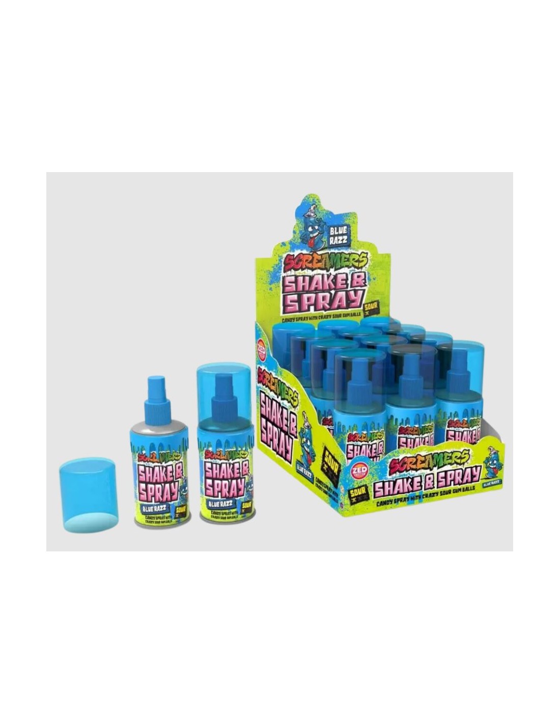 Liquid candy with sour fruit flavor in a bottle with a spray dispenser and fruit gum balls inside. Box with 12 sprays.