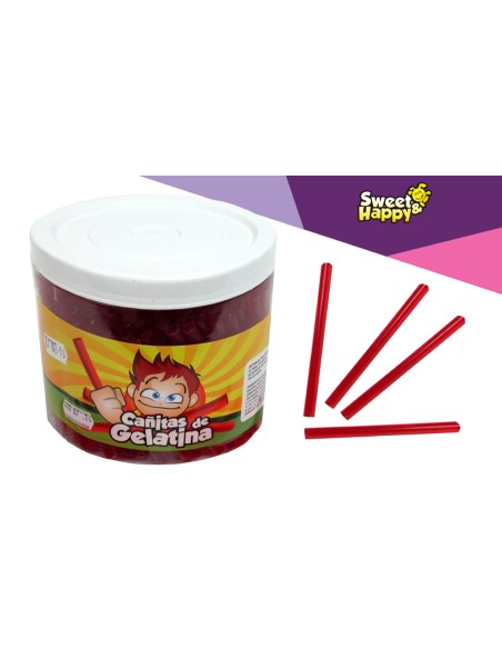 Transparent plastic straws filled with strawberry jelly. Jar of 340 straws.