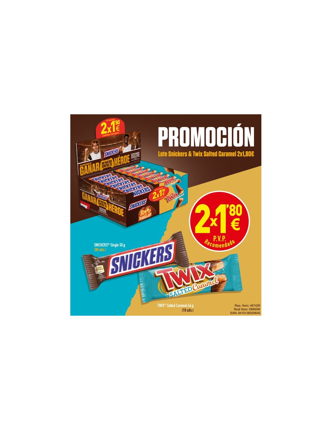Offer pack of chocolate bars from the Mars brand consisting of 30 Snickers bars 50 grams and 18 limited edition Twix Salted Caramel bars 46 grams. Savings of 20% on the regular price.