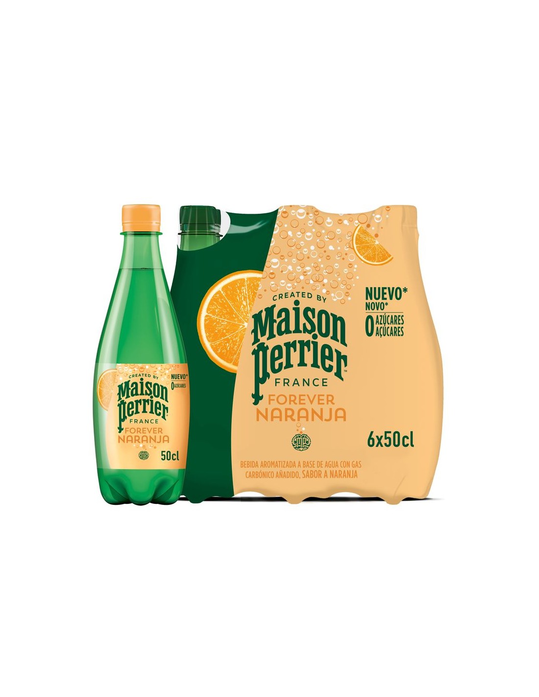 Agua con gas Perrier aromatizada con un suave toque de naranja. Se sirve en botella de pet con 50 cl. Pack con 6 botellas.