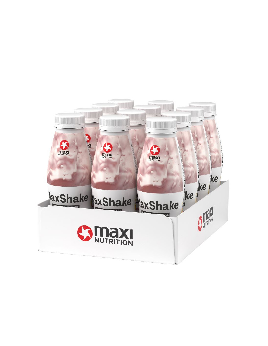 Batidos de proteínas de la casa alemana Maxi Nutrition con sabor a fresa. Se sirven en una botella con 330 mililitros. Cada batido aporta 25 gramos de proteína y tienen un bajo contenido en azúcar. Caja con 12 botellas.