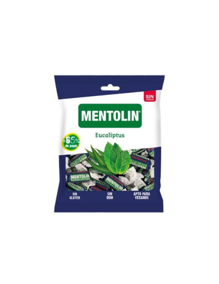 Caramelos duros sin azúcar de la marca Mentolín con refrescante sabor a eucalipto. Se sirven en bolsitas de 50 gramos cada una. Caja con 16 bolsitas.