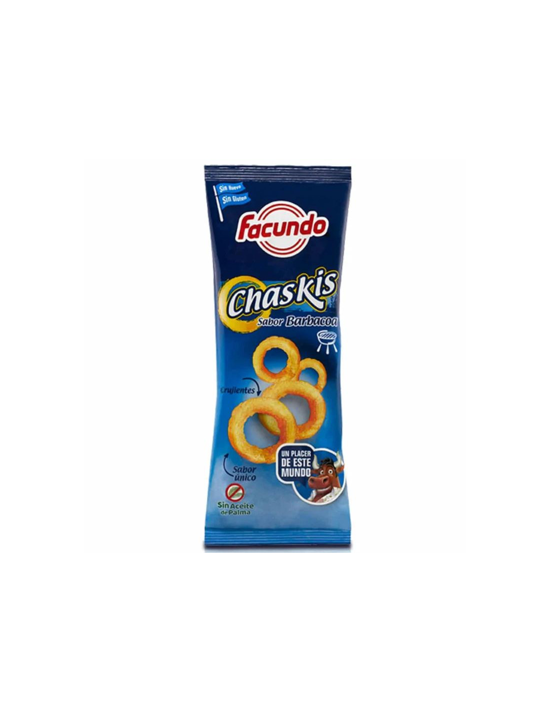 Aperitivo de maíz con forma de aros y con sabor barbacoa. Paquetes de 75 gramos cada uno. Caja de 24 paquetes.