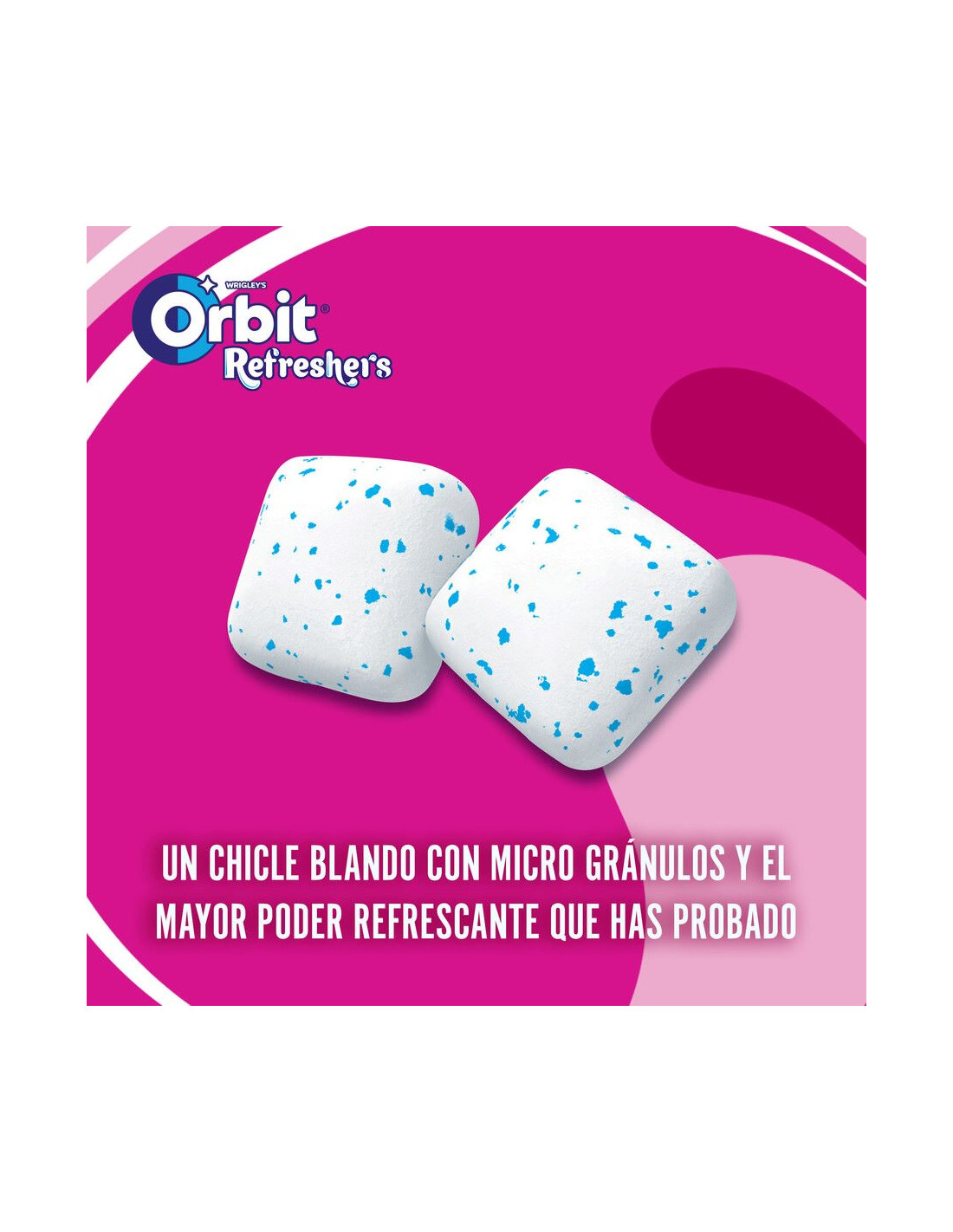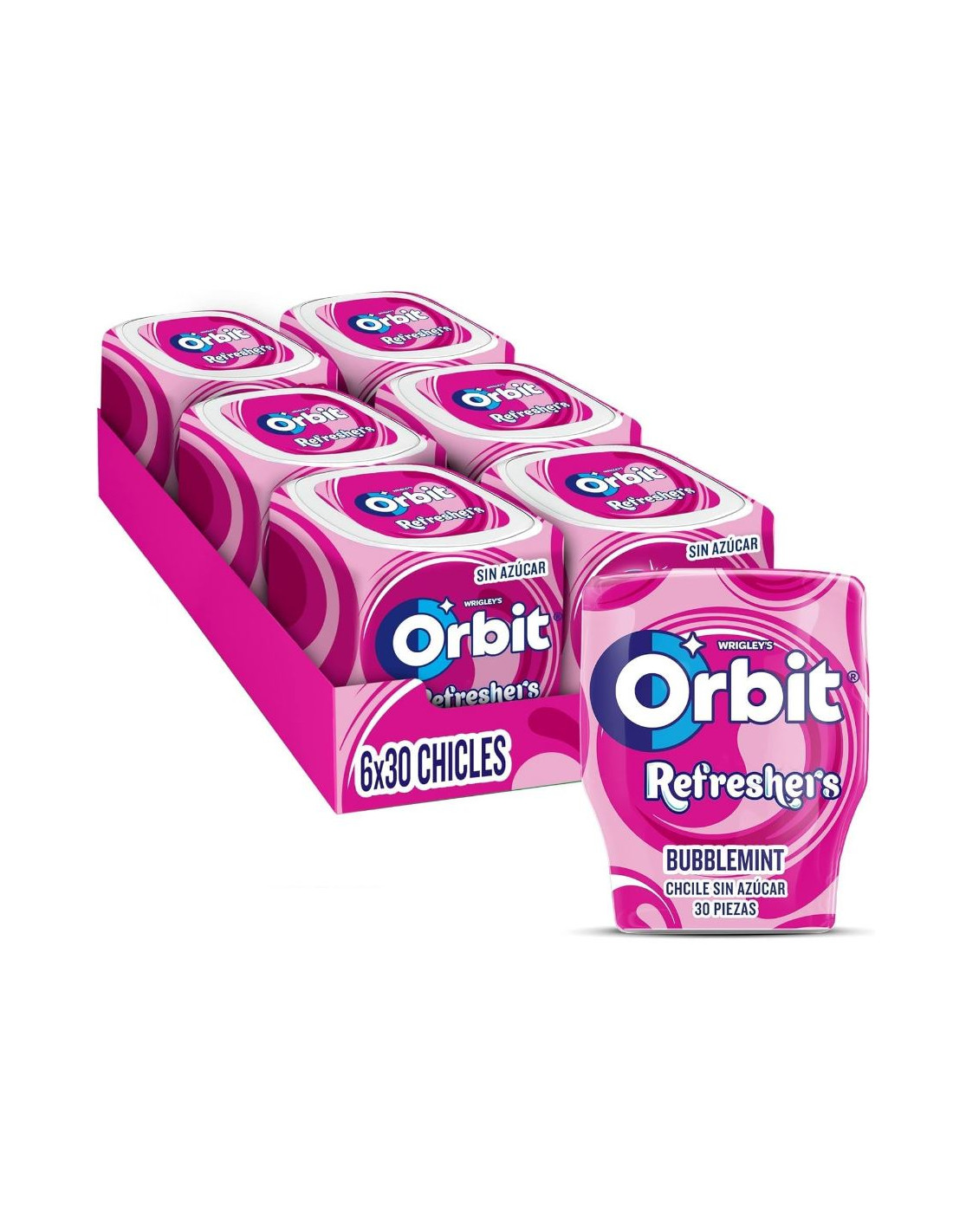 Refrescantes chicles sin azúcar Orbit Refreshers en grageas con sabor a fresa. Se sirven en botes de plástico con tapadera con 30 chicles cada uno. Caja con 6 botes.