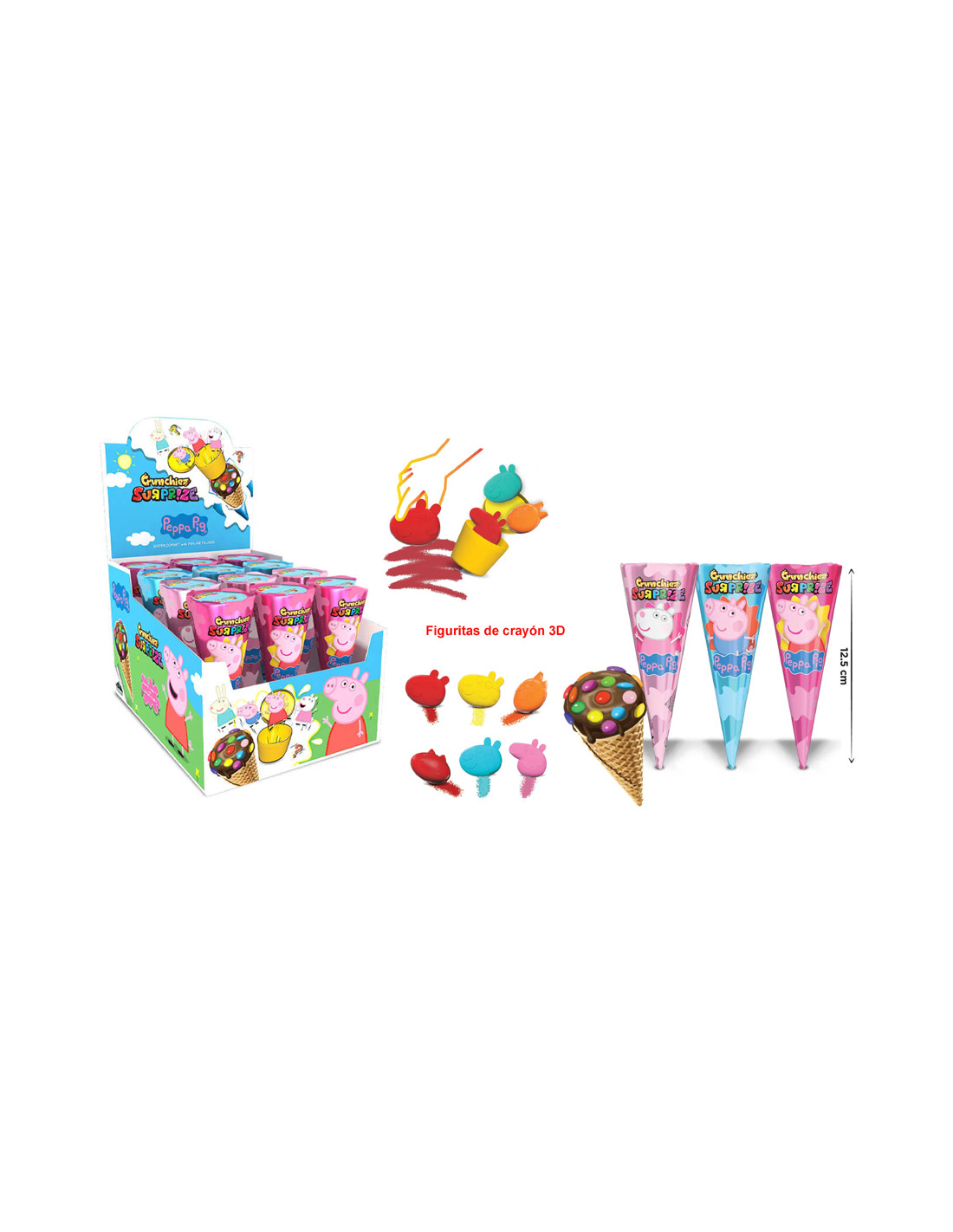 Conos de galleta con chocolate, rellenos de crema de avellana y con topping de grageas de chocolate de colores. Cada cono mide 13 centímetros de alto y contiene una sorpresa en el interior de la serie de dibujos animados Peppa Pig. Caja con 12 conos.