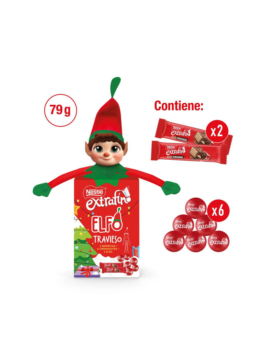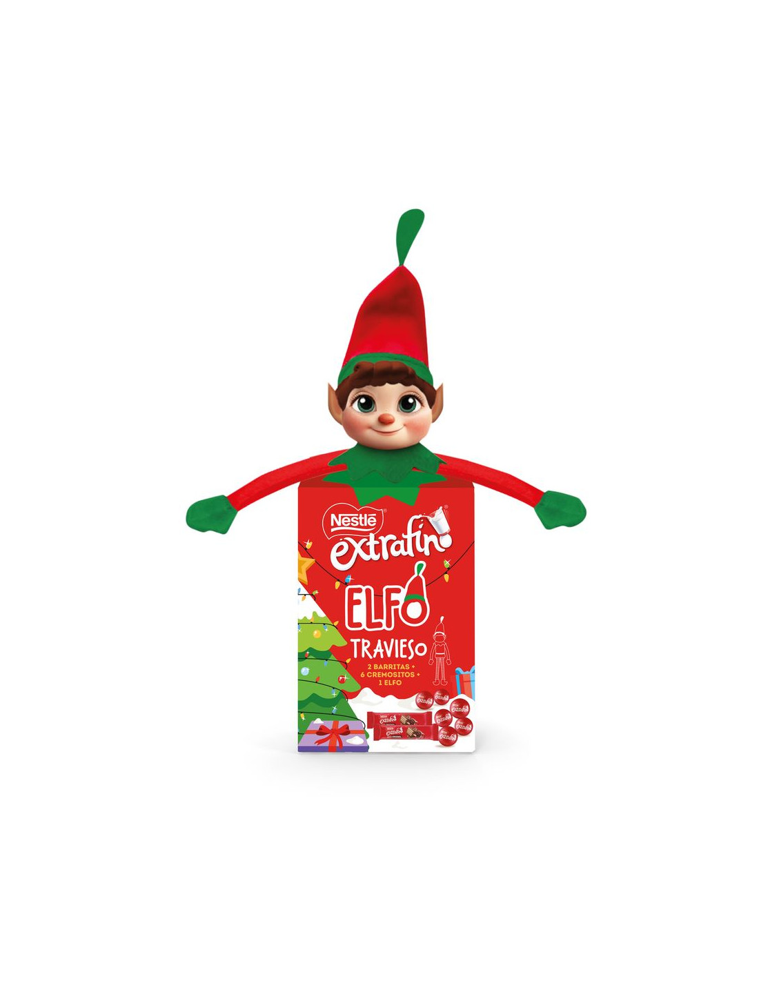 Pack de chocolatinas de Nestlé con 2 barritas de galleta Snack Extrafino Leche y 7 bolitas de chocolate con leche Extrafino rellenas de chocolate blanco. El pack contiene un muñeco del Elfo Travieso de la Navidad de 30 centímetros de largo.