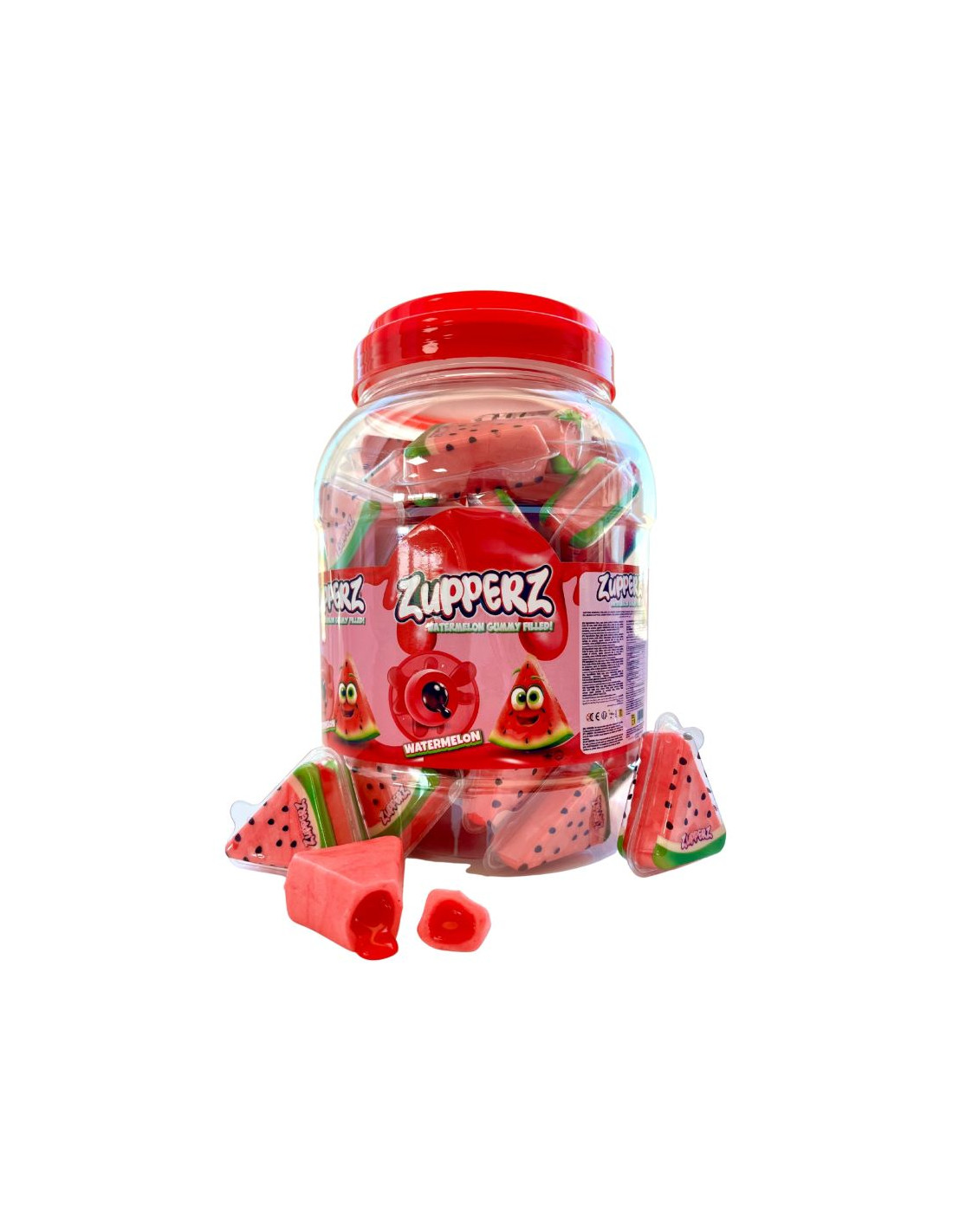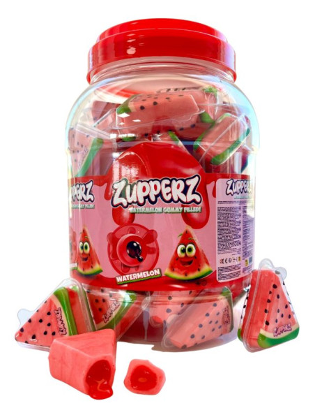 Gominolas con forma de tajadas de sandía rellenas de gelatina líquida con intenso sabor a sandía. Cada gominola va envuelta individualmente en una cápsula de plástico. Bote con 50 gominolas.