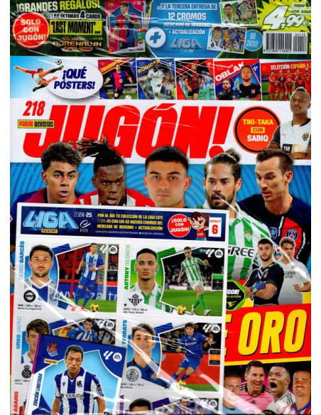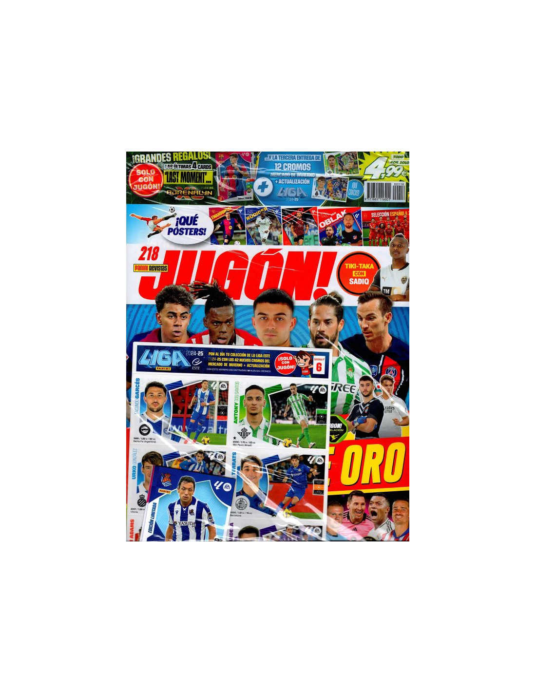 Revista Jugón número 218 de Panini + 12 cromos Mercado de invierno de la colección Liga Este + 4 cards Last Moment de Adrenalyn.